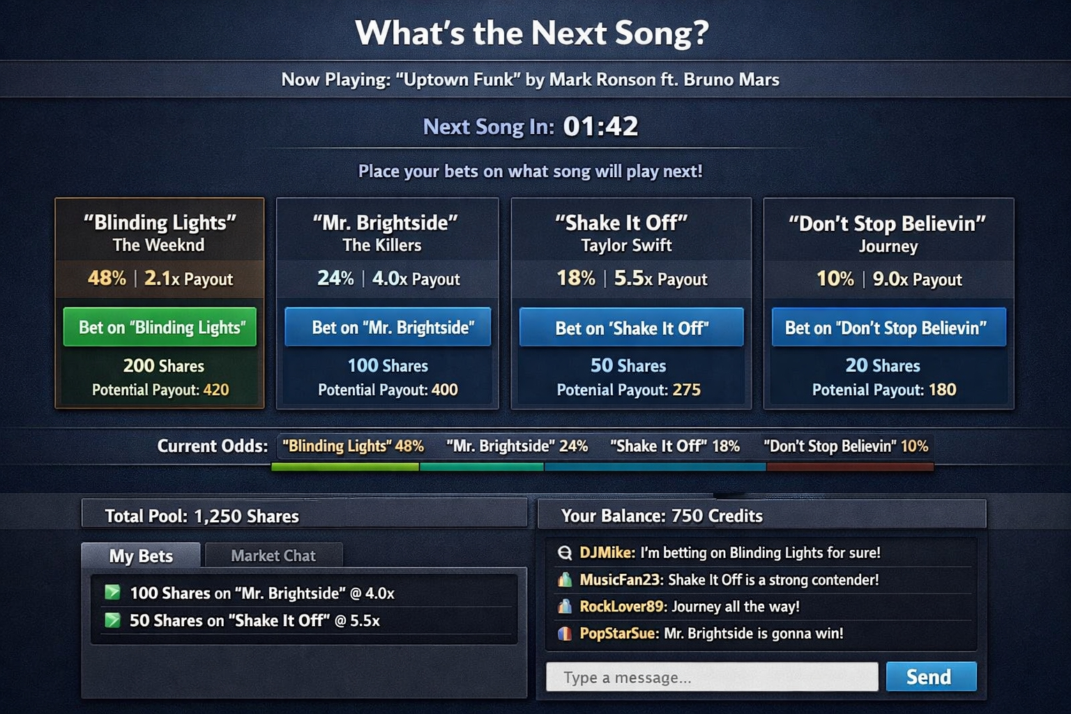 SpinBet’s platform generates live odds using a machine-learning model trained on over 40 million radio playlist events across 600 internet stations. Odds shift dynamically during the betting window as wager volume accumulates, creating a genuine market of listener prediction. Top-performing bettors appear on a live leaderboard visible to all AccuRadio FM listeners, adding a competitive social layer to the experience.